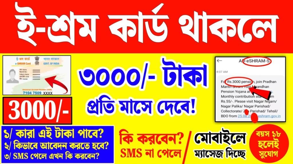 e-shram card 3000 per month apply message ই-শ্রম কার্ড থাকলে ৩০০০ টাকা পাবেন মেসেজ দিচ্ছে সবাইকে|